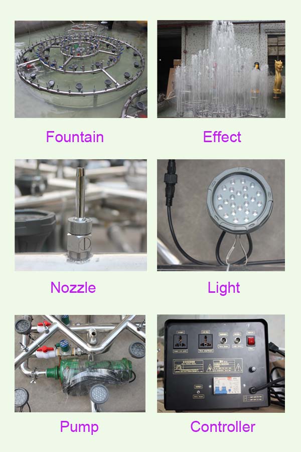 The water will dancing up and down contrlled by the music controller box.With RGB fountain light,very bueatiful effect at night.