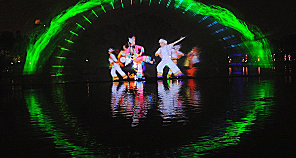水幕电影技术是一束光束照射在水面,展示着较强立体电影效果的一种多媒体技术.由于水幕电影具有无与伦比的光学效应,当电影播放时,颜色新鲜生动,字幕清晰。可以安装与湖面或者海里