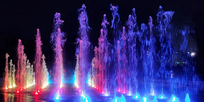 程控喷泉:这种喷泉一般规模都比较小,色彩单一,主要是按照预先编辑的程序变换喷水造型和灯光色彩强弱变化,可实时显示各个喷泉的工作状态和灯光状态,以及水泵和灯光的故障指示。程序一般可以随时修改,也可储存多种程序,随意调用。主要设计在住宅、庭院等场所。